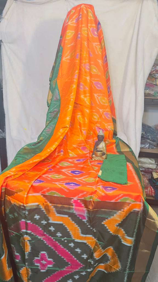 Orange & green pure silk Pochampalli ikkat Handloom Saree