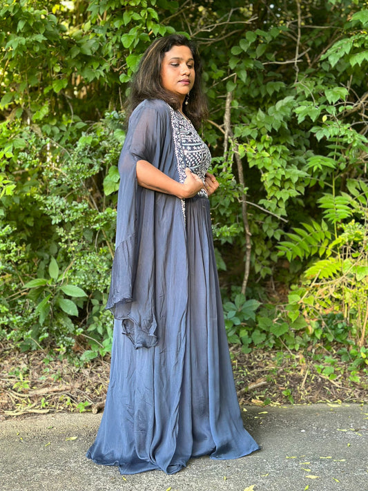 Grey Chinon Indowestern lehenga with handwork blouse & detachable jacket