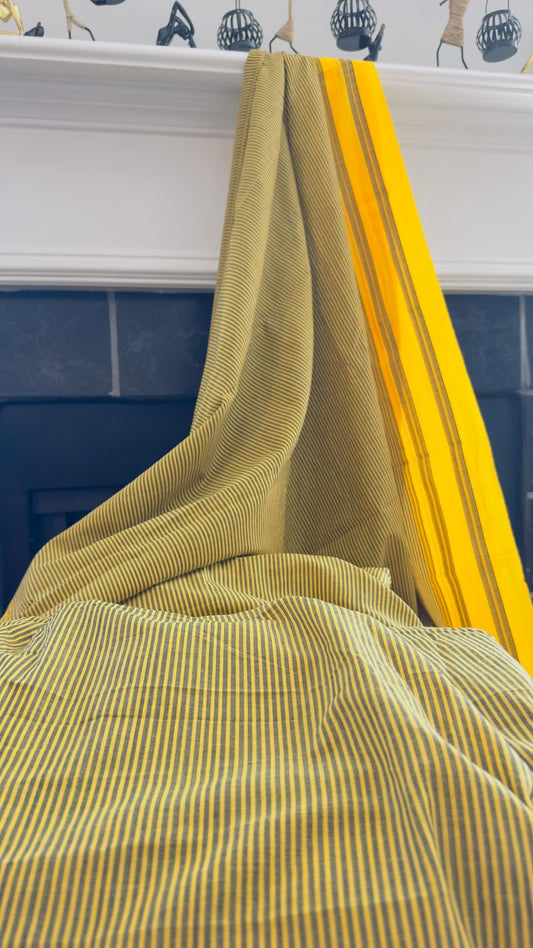 ILKAL Henna green Striped with mustard yellow and pink border SICO ( Cotton*Silk ) handloom saree with Chikapars Border