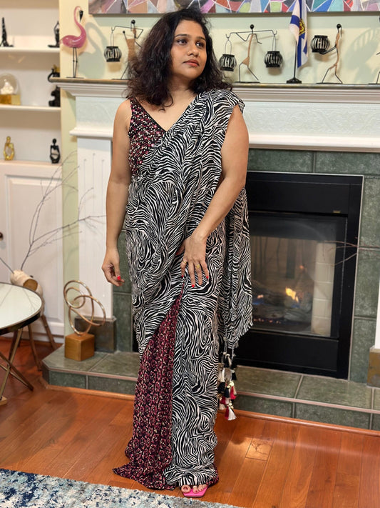 Black & white Zebra pattern designer Pre drape saree highlighted with beautiful tassels and blouse with real mirror, sequins handwork