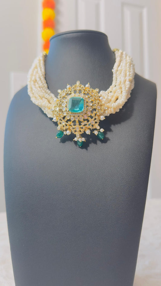 Pure 92.5 Silver Navratan pendant fresh water pearl choker embellishment with navratan semiprecious multicoloured gemstone.