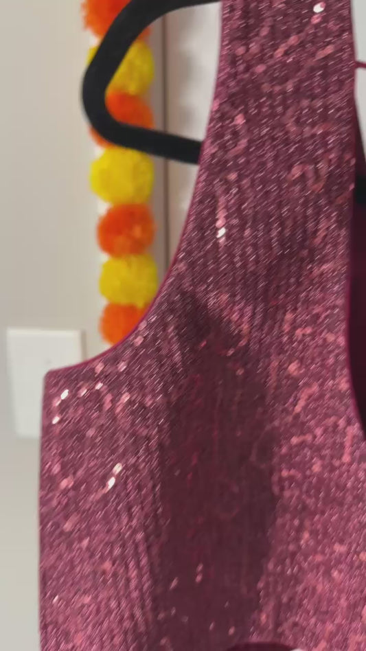 Onion-pink shimmer sequin blouse with adjustable back dori—elegant, comfortable, occasion-ready, dry clean, avoid brushing.