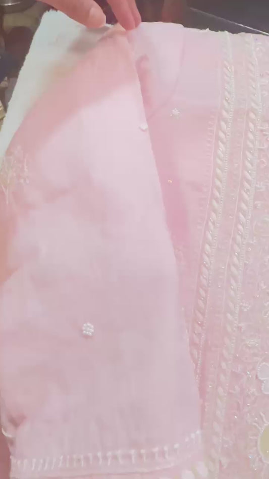 Baby pink pure Viscose georgette Mukaish pitta and pearl handwork suit